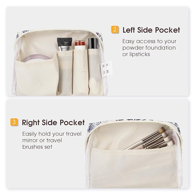 - Multiple Storage Compartments - Practical main compartment with 5 inner small pockets could neatly organize your makeup. Main compartment could hold many small items. Left side pockets could hold your concealer or lipsticks, while right side pocket are great for your travel mirror or travel brushes set. It could fit lipstick, blushes, powder, eyeliner, foundation, concealer, eyeshadow pallet, mascara, lash curler, sponage, small brushes