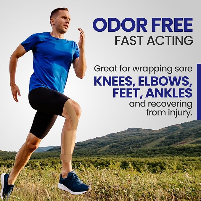 - EASY TO APPLY AND STAYS ON β Great for wrapping sore knees, elbows, feet, and ankles, the 2 inch by 10 inch tape strips are built on kinesiology cloth to move with you throughout all activities and will not fall off like other patches and gels. Its industry-proven adhesive materials are safe for everyone and stay on for up to 12 hours while recovering from injury.