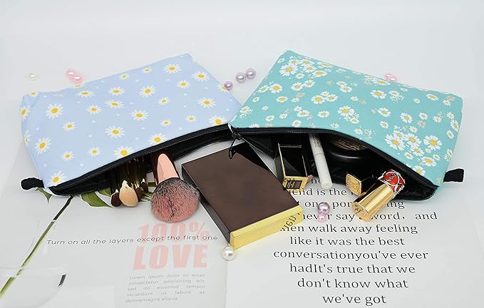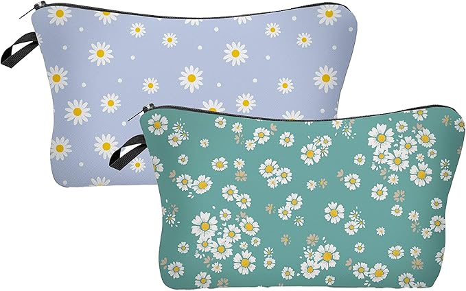 2 Pcs Cosmetic Bag for Women Small Make Up Bag Waterproof Travel Toiletries Pouch with Zipper for Organizing Small Items, Gift Bags for Birthday Christmas(Daisy Flower 2)