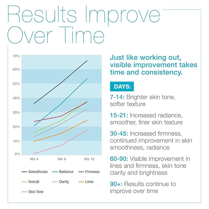 • PROFESSIONAL LEVEL RESULTS: Lines + Wrinkles. + Crepiness + Firmness + Lift + Radiance + Brightness + Skin Tone Clarity + Smooth Texture + Soft Suppleness. Brighter skin tone, improved clarity and boosted radiance within 14-21 days. Results accelerate in 60-90 days with dramatic visible improvements in fine lines, firmness and smoothness. Results continue to improve over time with long-term use.