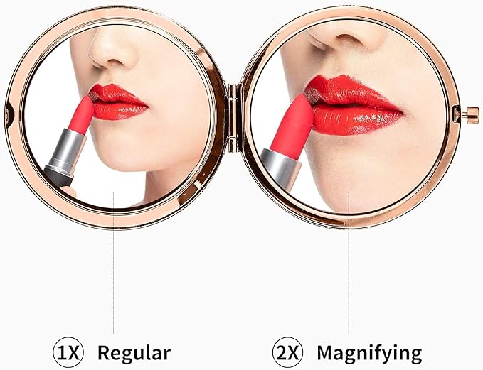 - Double-sided round mirror: one side of the personal makeup mirror shows a regular size circle mirror, the picture is clear and will not be deformed, and the other side is a 2x magnifying glass, which is convenient for checking your eyeliner, lipstick and other details, so that you can always keep beautiful.