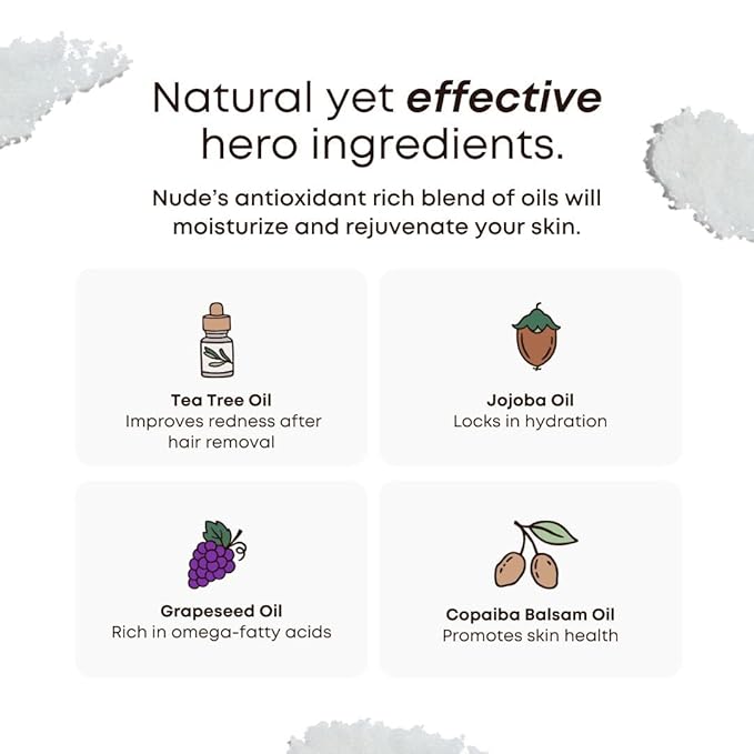 - How Nude Scrub Works: An exfoliating body scrub formulated with sugar and a hydrating blend of mixed oils like jojoba seed, tea tree and grapeseed; that leaves skin hydrated, and soft while reducing the appearance of ingrown hair and razor bumps via exfoliation. For External Use Only.