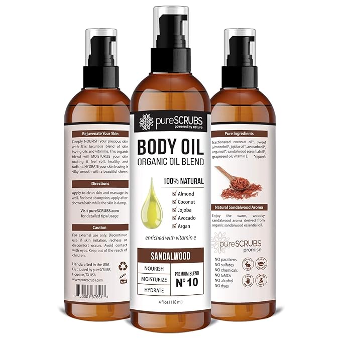 - π€ Our Sandalwood Body Oil is a 100% pure botanical super blend of jojoba, coconut, argan, avocado & sweet almond oils enriched with vitamin e and grapeseed oil will do wonders for your skin such as smoothing out wrinkles and minimizing the appearance of stretch marks and scars giving that youthful appearance and a healthy, natural glow.