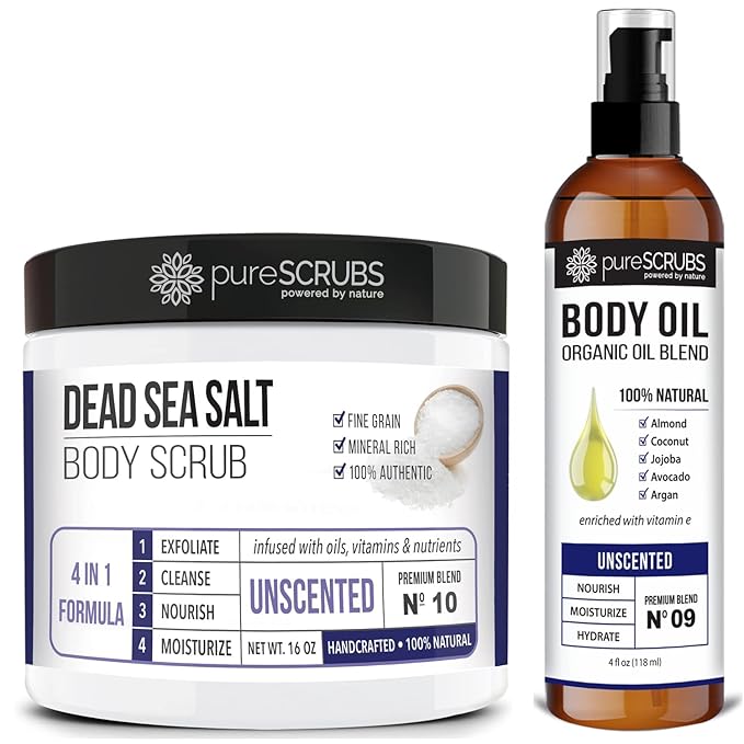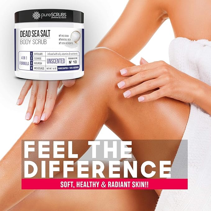 - π Our Unscented Body Scrub is perfect for sensitive noses and will EXFOLIATE, CLEANSE, NOURISH & MOISTURIZE your skin. Fine grain dead sea salt infused with organic essential oils, nutrients and skin softeners will transform your skin making it soft, healthy and radiant. Helps reduce appearance of cellulite, stretch marks, dark spots & acne scars.
