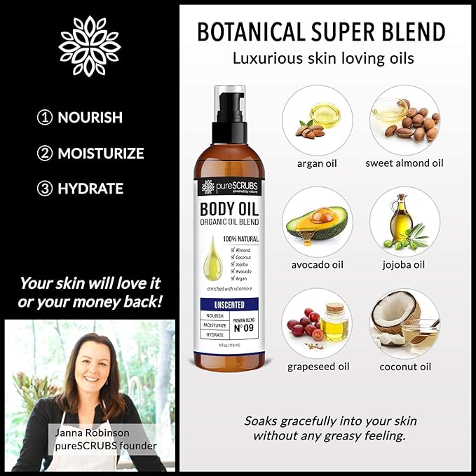 - π Our Unscented Body Oil is a 100% pure botanical super blend of jojoba, coconut, argan, avocado & sweet almond oils enriched with vitamin e and grapeseed oil will do wonders for your skin such as smoothing out wrinkles and minimizing the appearance of stretch marks and scars giving that youthful appearance and a healthy, natural glow.