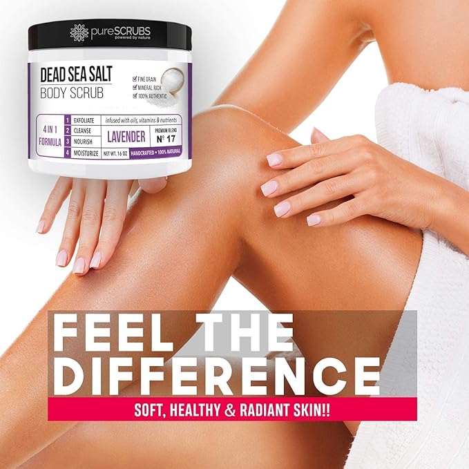 - π Our Lavender Body Scrub will EXFOLIATE, CLEANSE, NOURISH & MOISTURIZE your skin. Fine grain dead sea salt infused with organic essential oils, nutrients and skin softeners will transform your skin making it soft, healthy and radiant. Helps reduce appearance of cellulite, stretch marks, dark spots & acne scars. You'll love the lavender aroma!