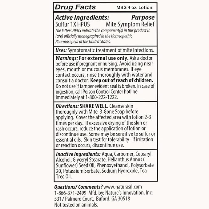 • Mite-B-Gone's Lotion is a 100% Natural Formula that includes Sunflower Seed Oil and Tea Tree Oil. This known soothing and anti-inflammatory blend quickly counteracts itching and progressively clears up discomfort.
