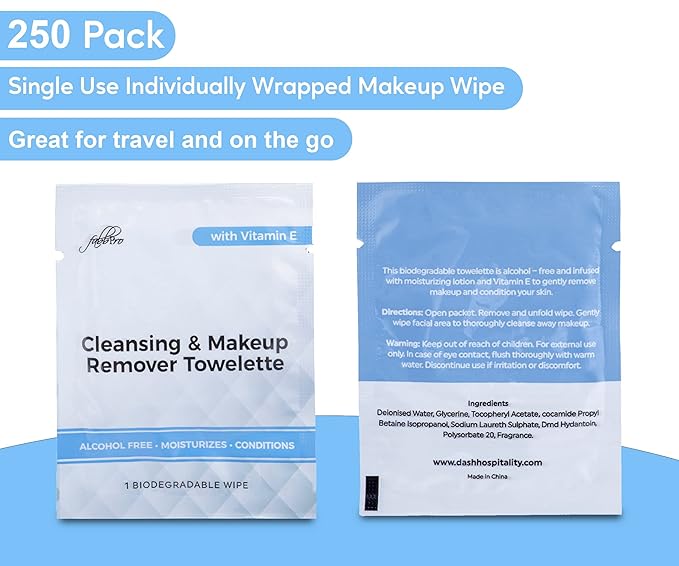 Cleansing & Makeup Remover Towelette with Vitamin E – Alcohol-Free Heavy Face Cleansing Wipes – Exfoliating Makeup Remover Wipes – Biodegradable & Eco Friendly Make up Remover Face Wipes - Pack of 250