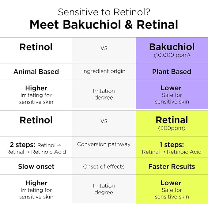 - πNEXT-GEN RETINOL: Formulated with two next-gen retinol alternatives, Bakuchiol (1%) and Retinal (0.03%). Retinal is the perfect alternative to the irritation of Retinol with a higher activity level. Bakuchiol is a plant-based retinol alternative with fewer side effects and is safer to be used for all skin types, making it easy for beginners. Formulated alongside with Hyaluronic Acid and ceramide, it works during your sleep so you can wake up to a visibly smoother, bouncier skin.