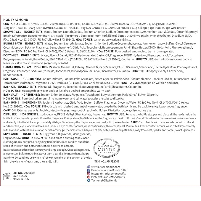 • NO RISK PURCHASE: We are confident that you will be happy with this Bath Gift Basket! However, if you still have any questions, please feel free to contact us, we will do everything we can to make it right! Thank you for choosing ArioseMonde