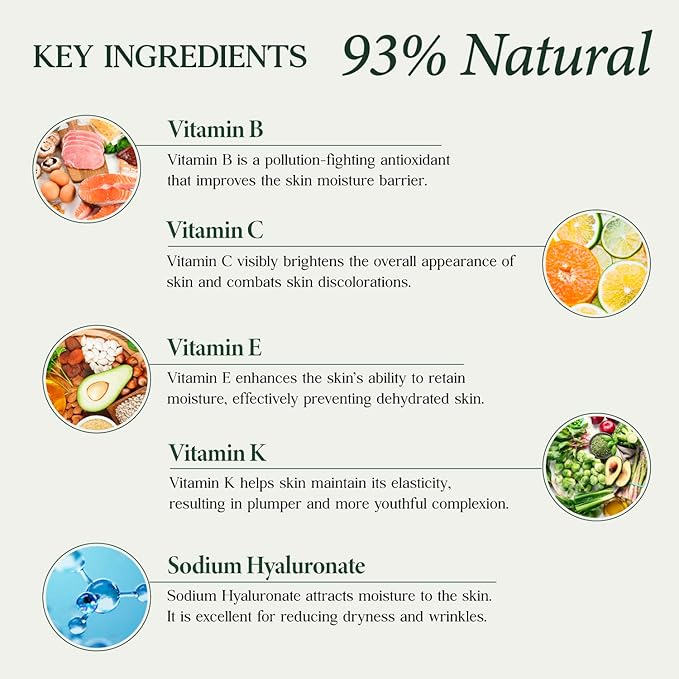 - Comprehensive Antioxidant Protection: Formulated with a potent blend of Vitamins B (Panthenol), C (Ascorbic Acid), E (Tocopheryl Acetate), and K (Menadione) that work synergistically to protect your skin from harmful free radicals, environmental pollution, and UV damage, helping to prevent premature aging.