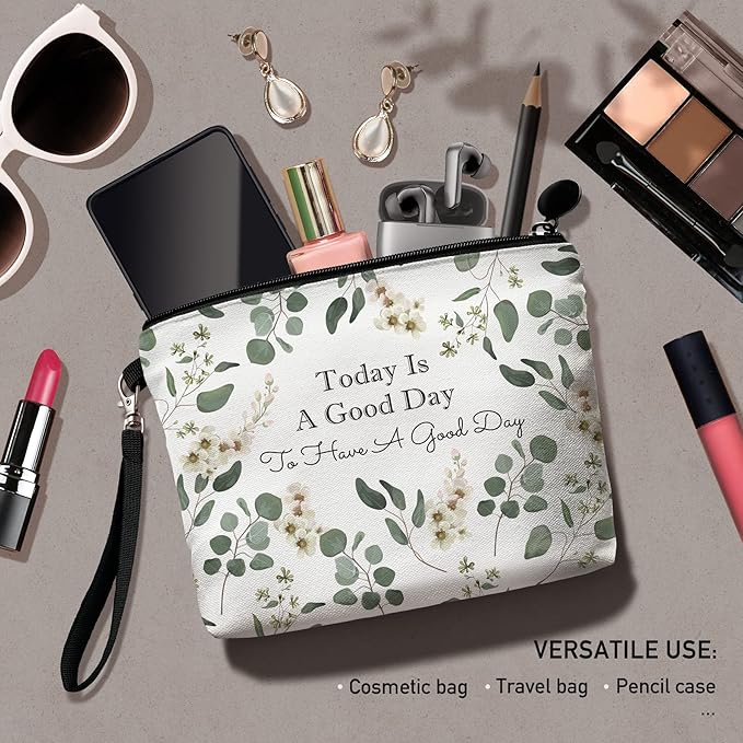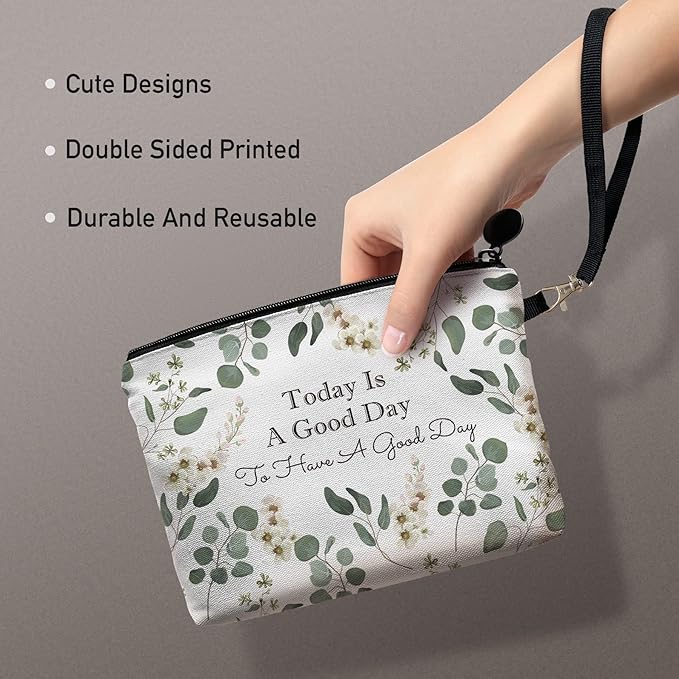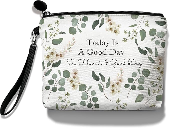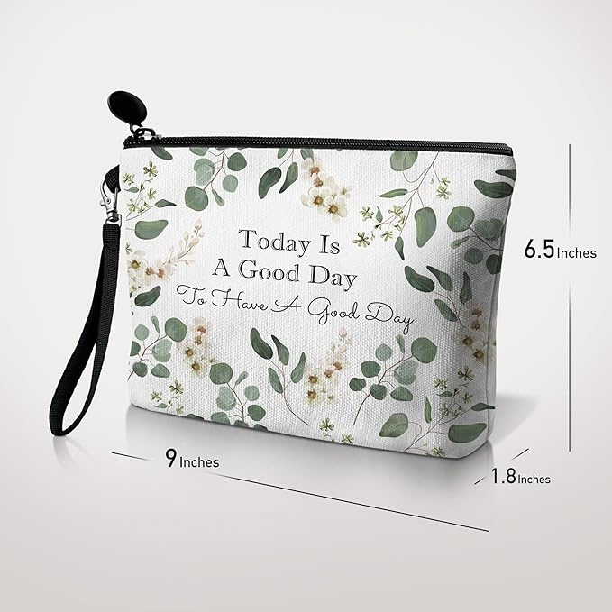 - UNIQUE DESIGN&FUNNY THEME - Hglian today is a good day makeup bag designed with beautiful eucalyptus leaves patterns,inspirational sayings,double-sided printed,reliable smooth zippers,removable wrist strap.An essential for every fashion women or girl.Sometimes, all we need is the right attitude.Take with this cute makeup bag,to have a good day with you~