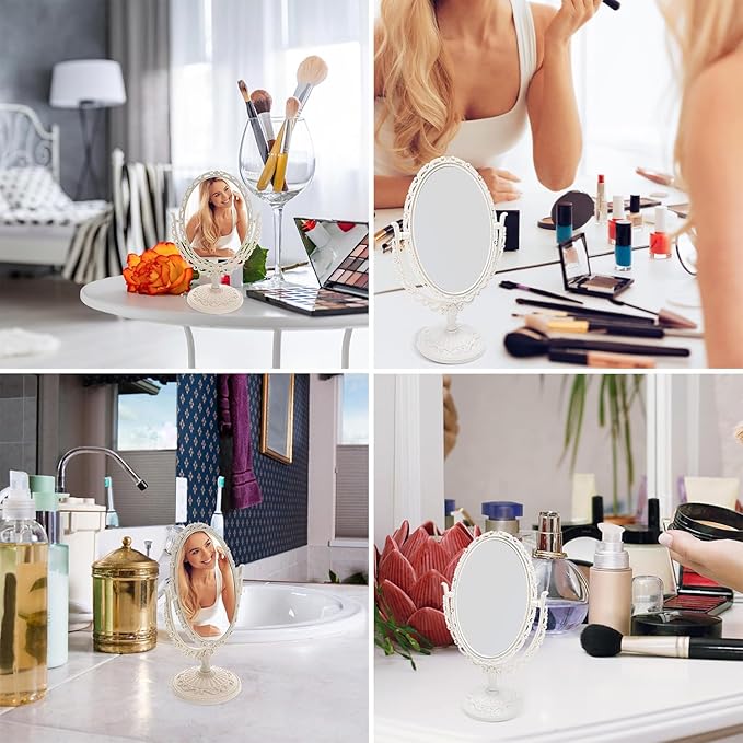 AKOAK 1 Pack Desktop Makeup Mirror, Oval Desk Makeup Mirror, Double-Sided 360-degree Rotating Makeup Mirror Bathroom Bedroom Makeup Mirror, Travel Mirror Suitable for Women (Beige)