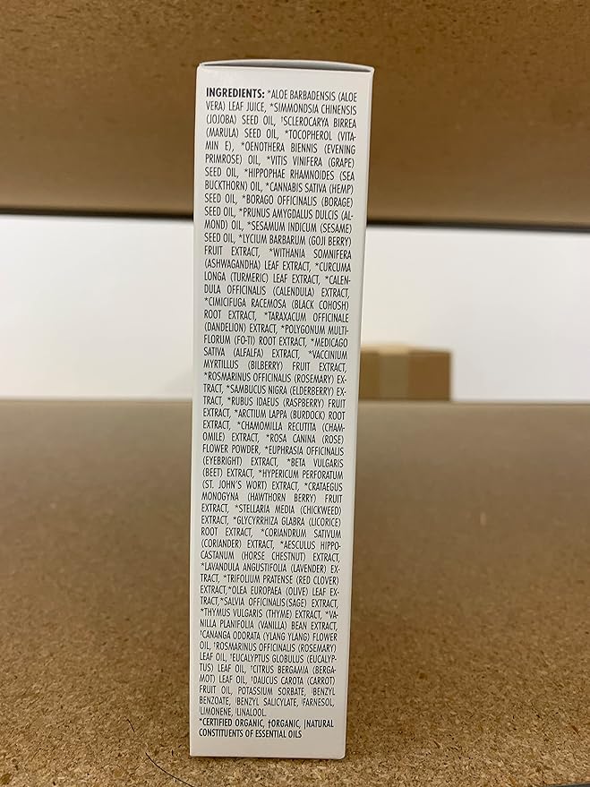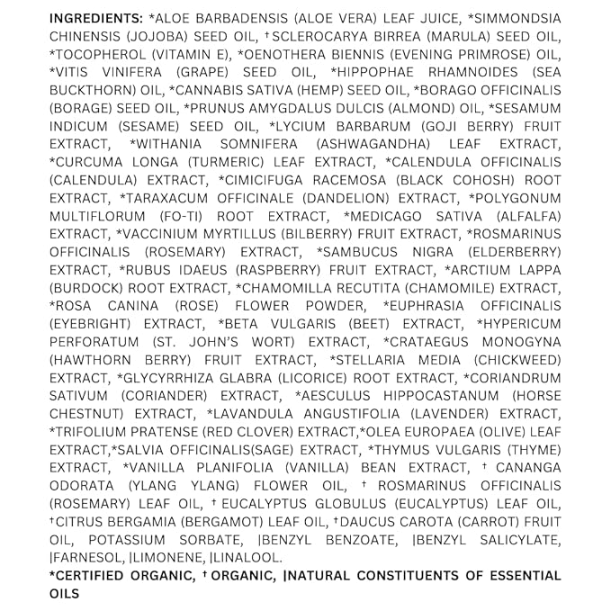 - Active Ingredients : *Aloe Vera Leaf Juice, *Jojoba Oil, β Marula Oil, *Vitamin E, *Evening Primrose Oil, *Grape Seed Oil,*Sea Buckthorn Oil, *Hemp Seed Oil, *Borage Seed Oil, *Almond Oil, *Sesame Oil, *Goji Berry, *Ashwagandha, *Turmeric, *Calendula, *Black Cohosh, *Dandelion, *Fo-Ti Root, *Alfalfa, *Bilberry, *Rosemary, *Elderberry, *Raspberry Leaf, *Burdock, *Chamomile, *Rose Hips, *Eyebright, *Beetroot, *St. Johnβs Wort, * Hawthorne Berry, *Chickweed, *Licorice, *Coriander, *Horse Chestnut, *Lavender, *Red Clover, *Olive Leaf, *Sage, *Thyme, *Vanilla Extract, β YlangYlang Essential Oil, β Rosemary Essential Oil, β Eucalyptus Essential Oil, β Bergamot (FCF) Essential Oil, β Carrot Essential Seed Oil, Potassium Sorbate *Aloe Vera Leaf Juice, *Jojoba Oil, β Marula Oil, *Vitamin E, *Evening Primrose Oil, *Grape Seed Oil,*Sea Buckthorn Oil, *Hemp Seed Oil, *Borage Seed Oil, *Almond Oil, *Sesameβ¦ See more