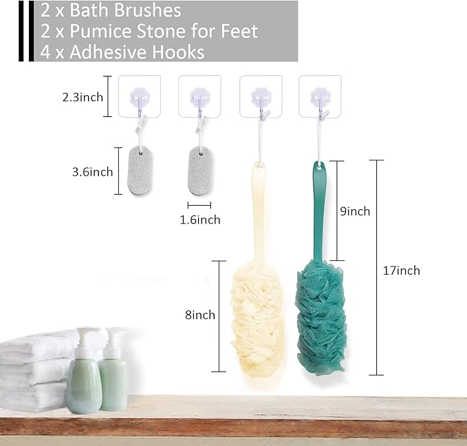 - Package Includes: 2 Pack Deluxe loofah back scrubbers for full exfoliating and cleansing in bathing, 2 Pc pumice stones can exfoliation and 4 Pc adhesive wall hook for convenient hanging.