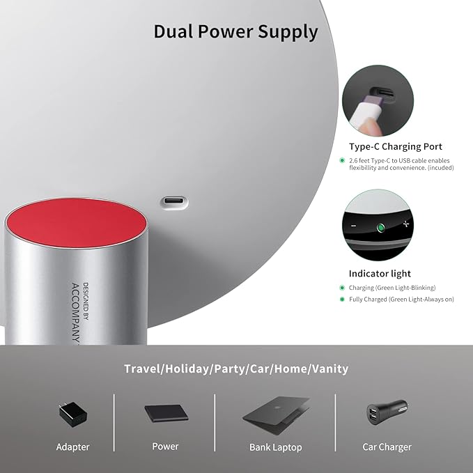 • USB rechargeable and built-in 2000 mAh Battery: AMIRO makeup mirror has a built-in 2200 mAh rechargeable lithium battery, which continuously works for up to 3-5h after fully charged. It can be charged through a USB by a power bank, PC, etc., and work lighted for a long time. Convenient to move the vanity mirror with lights to another desk. Note: The USB-C cable is in the box.