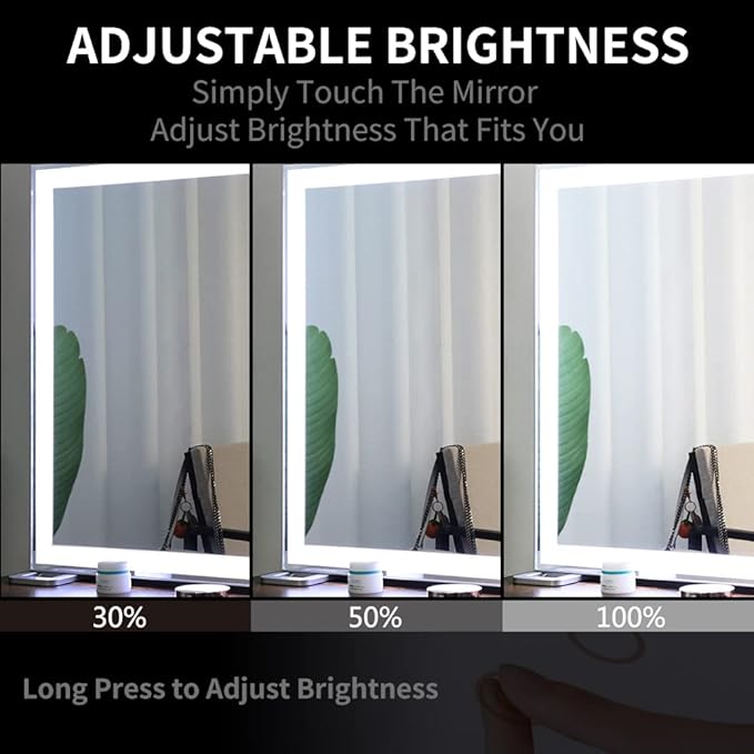 • 3 COLOR LIGHTS & ADJUSTABLE BRIGHTNESS: Freely switch daylight / natural light / warm light, this vanity makeup mirror can be changed the brightness and light temperature by 3 independent switch. Memory function keep the same light setting when turn on again. Each brightness is suitable for different atmospheres: make-up, skincare, costume checking, etc.