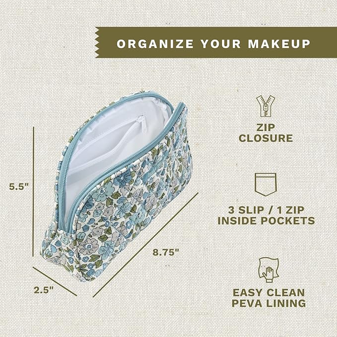 Bella Taylor Large Quilted Cotton Makeup Pouch for Women, Travel Cosmetic Bag, Quilted Cotton Delicate Floral Blue
