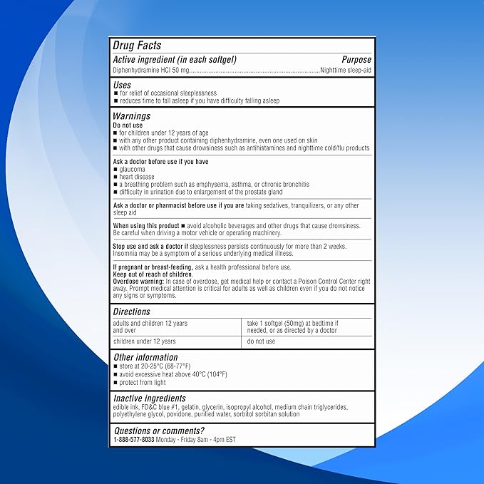 - ✅ DIPHENHYDRAMINE HCL 50mg: Formulated with Active ingredient diphenhydramine HCl 50mg for occasional nighttime lack of sleep.