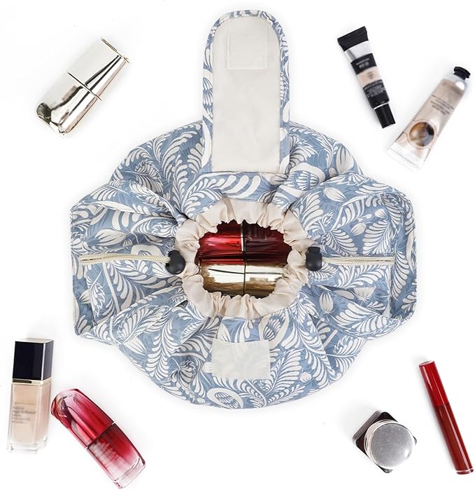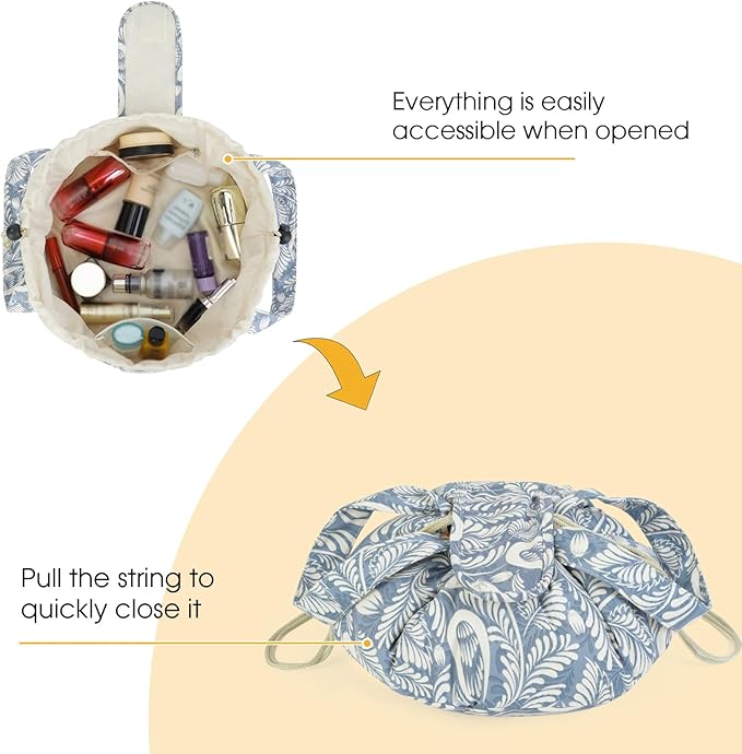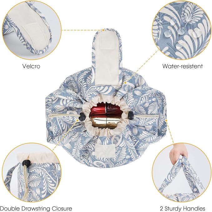 Barrel Drawstring Makeup Bag Large Cosmetic Bag Make up Bags Toiletry Organizer for Women (Blue Leaf) (Patent)