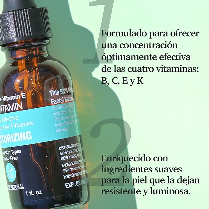 - [OPTIMALLY EFFECTIVE CONCENTRATION OF ALL FOUR VITAMINS] This multi-vitamin serum contains Vitamin B, C, E, and K. Vitamin B decreases redness and helps with the skin texture. Vitamin C promotes even skin tone by reducing the appearance of discolorations. Vitamin E penetrates the skinβs cells to provide long-lasting hydration and protect the moisture barrier. Vitamin K protects collagen in the body for smooth and plump complexion. It is an essential vitamin for skin recovery.