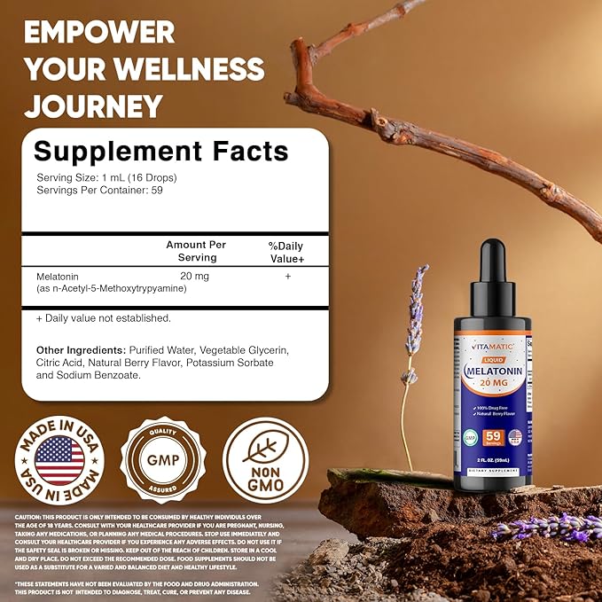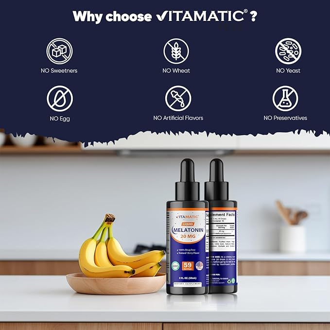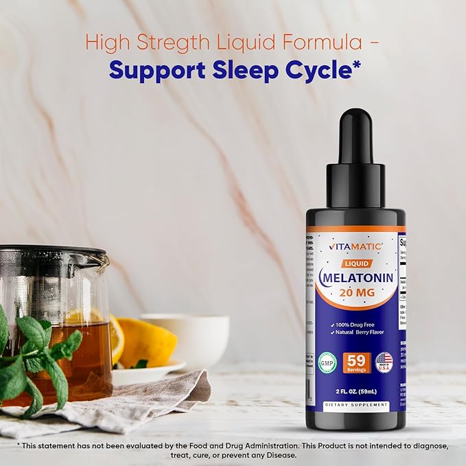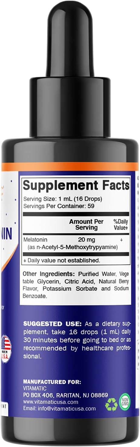 Vitamatic Melatonin 20mg Liquid Drops – 2 Fluid Ounce (59ml) – Natural Berry Flavor – for Adults – Non-GMO – Vegetarian Supplement