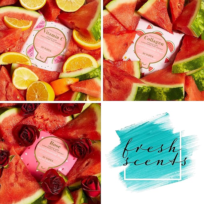 - 4 SCENTS | These wipes include 4 packages of 30 wipes for a total of 120 pieces. Each package is infused with its own unique scent: Aloe, Collagen, Rose, and Vitamin C.
