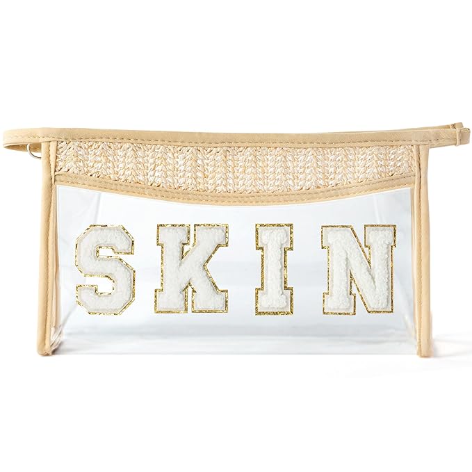 Boho Patch Cosmetic Bag - Summer Gift SKIN Chenille Varsity Letter Toiletry Kit Beige Clear Waterproof Travel Makeup Bag PVC Zipper Clutch Daily Use Purse for Women Girls