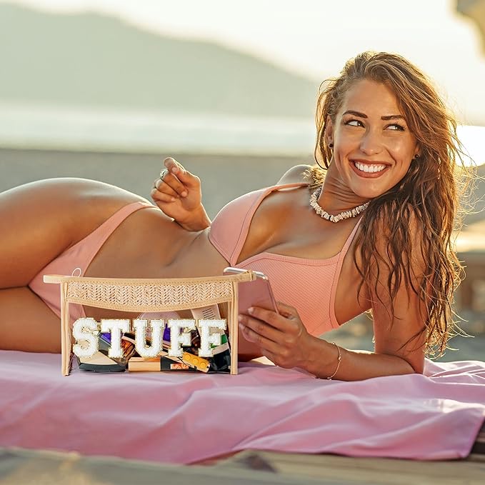 Boho Patch STUFF Cosmetic Bag - Summer Preppy STUFF Chenille Varsity Letter Toiletry Makeup Bag Clear Waterproof Travel Beach Makeup Pouch PVC Zipper Clutch Daily Use Purse for Women Girls