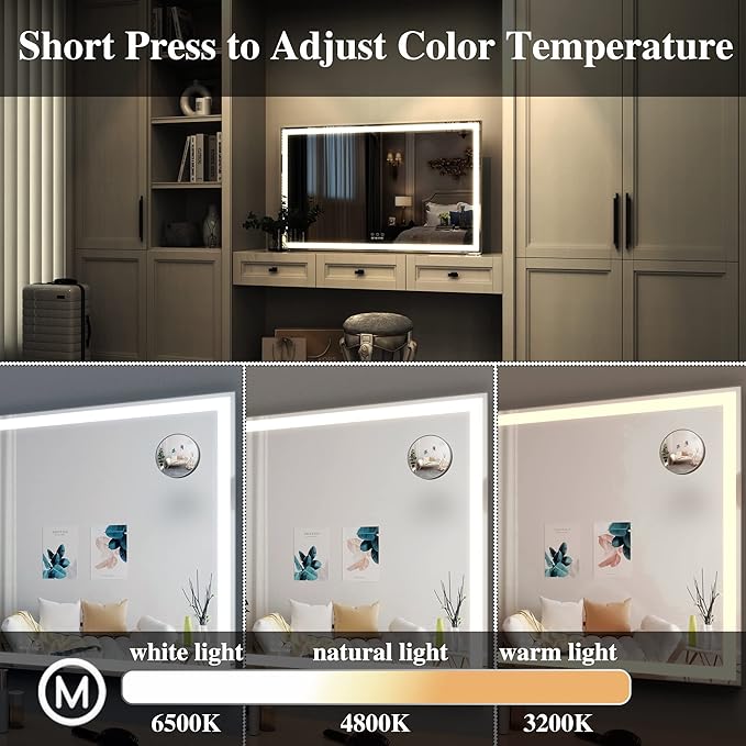 • SMART VANITY MIRROR: The vanity mirror with LED light strip provides the smart touch button. Middle button for turning on and turning off; left button for changing lights color; right button for adjusting brightness. Memory function keep the same light setting when turn on again.