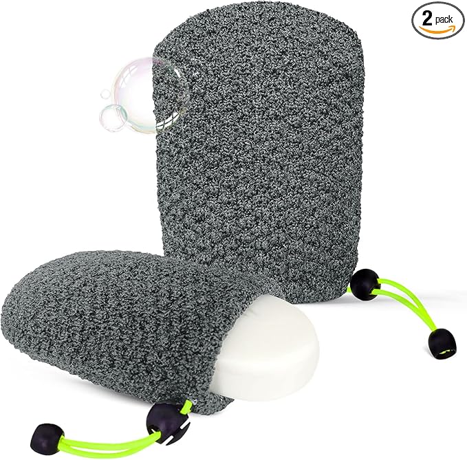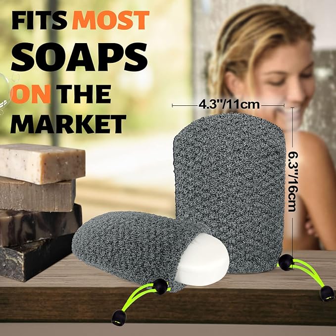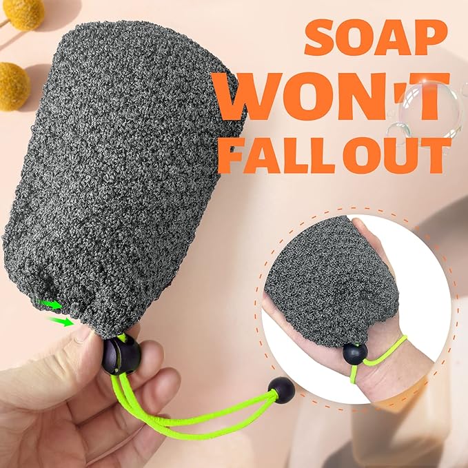 - No More Dropping Soap: Our soap pouch has durable, perfect texture and creates good suds. Wash your top half then remove the soap from the pouch and still have a lot of lather to scrub bottom half. It holds a full soap bar and feels good in the hand, Shrink cord on the soap scrub bag keeps soap from slipping out. Put the string around your wrist or hang soapbag on the wall, itβs all up to you how you want to use it.