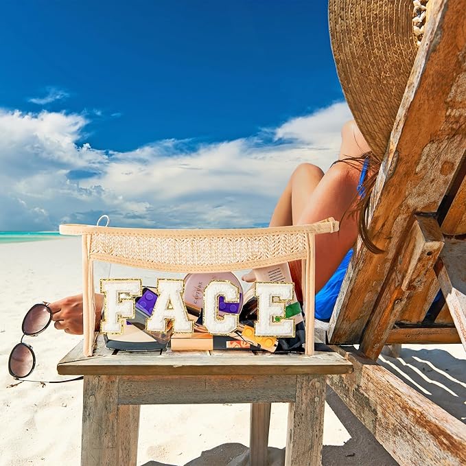 Boho Patch Face Cosmetic Bag - Summer FACE Chenille Varsity Toiletry Makeup Bag Beige Letter Clear Waterproof Travel PVC Zipper Clutch Daily Use Purse Summer Beach Pool Pouch for Women Girl
