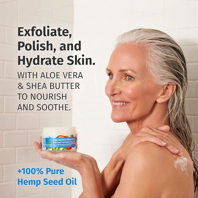 - Enriched Moisturisers - HEMPZ body scrub is also enriched with key moisturisers, ensuring skin is left feeling hydrated and plump. Enriched with Shea Butter & 100% pure natural hemp seed oil all have hydrating properties, so your dewy glow lasts longer.