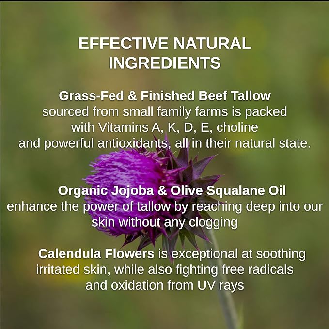 - Only 4 organic ingredients: 100% grass-fed tallow, real squalane oil, jojoba and calendula flowers.