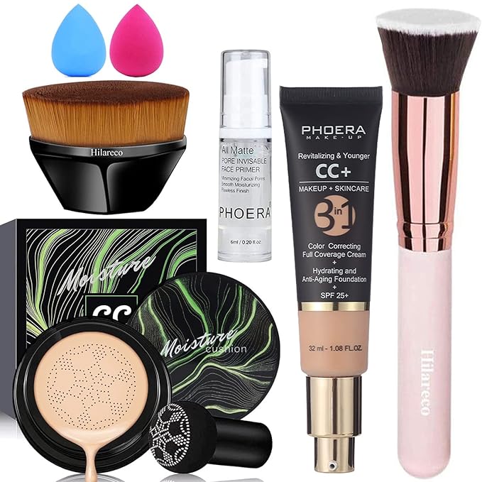 Mushroom Head Air Cushion CC Cream Natural Foundation,PHOERA CC Cream Foundation With SPF,Color Correcting Anti Aging Hydrating Serum,PHOERA Face Primer (#03 Warm Nude +#120 Nude)