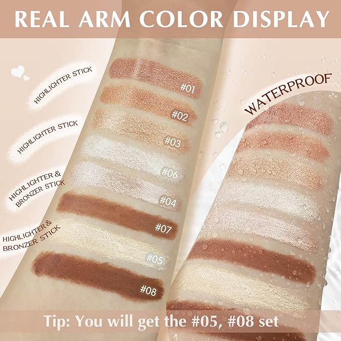 • 【Waterproof & Long Lasting】This highlighter bronzer stick is waterproof and long-lasting, ensuring that your glowing complexion stays put all day long. Whether you're sweating at the gym or caught in the rain, you can trust that this pen won't budge or smudge. Additionally, its long-lasting formula means that you don't have to touch up your highlight throughout the day, saving you time and effort. You can apply this pen in the morning and enjoy a fresh, glowing complexion all day long.
