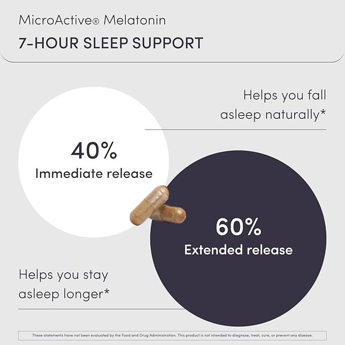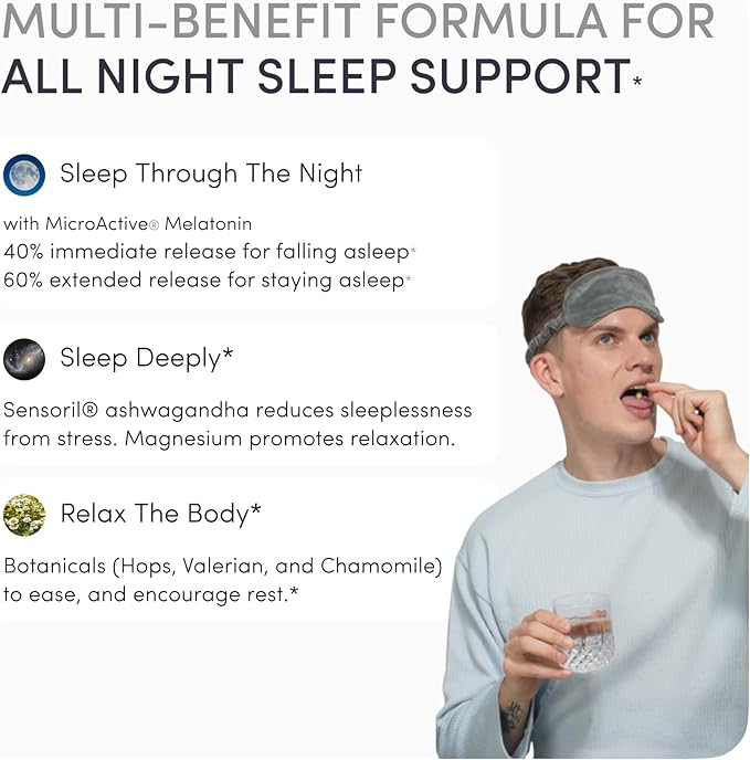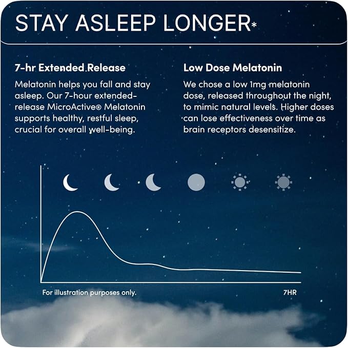 - Sleep Through the Night: A revolutionary blend of 7-hour time release MicroActive Melatonin helps you fall asleep and stay asleep. We chose a low 1mg melatonin dose, released throughout the night, to mimic natural levels. Extra strength melatonin can lose effectiveness over time as brain receptors desensitize. Clinically tested Sensoril ashwagandha reduces sleeplessness from stress. Chelated magnesium malate guides the mind and body into relaxation. A blend of botanicals, including Hops, Valerian, and Chamomile to soothe and encourage rest.*