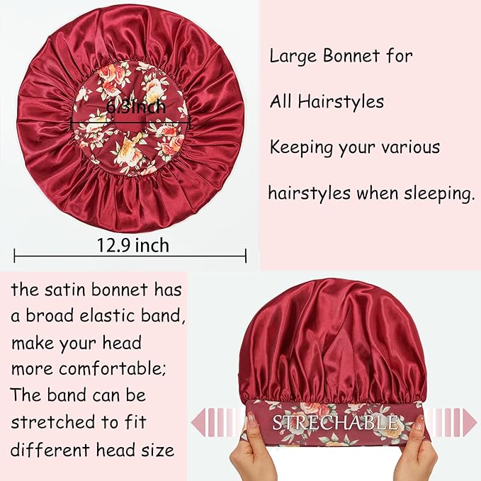 - Silk Bonnet with Elastic Broad Bands: The satin bonnet have a broad elastic band, it can be stretched to fit different head size, which will make your head more comfortable, but won't make your head feel tight.