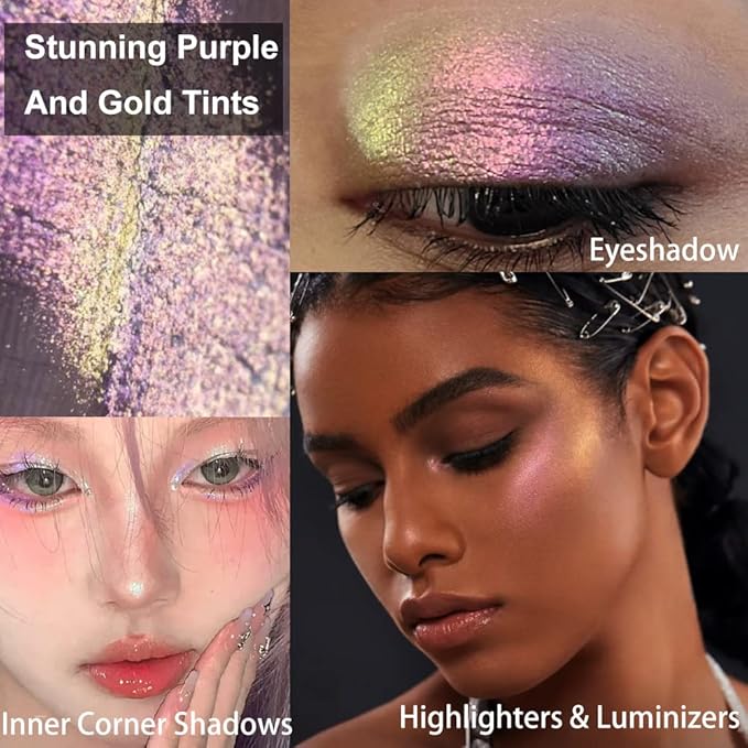 Afflano Purple-Gold Duo Chrome Multichrome Eyeshadow, Holographic Glitter, Color Change Sparkle Chameleon Luminizer Highlighter