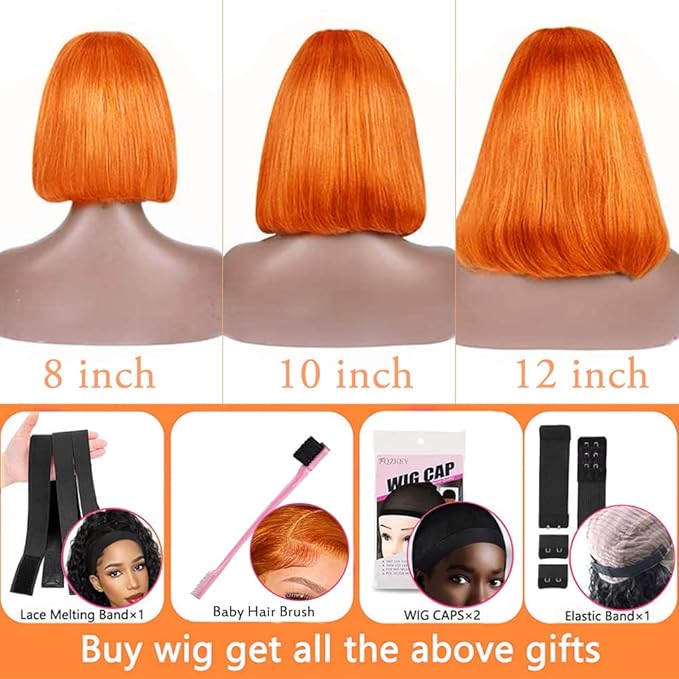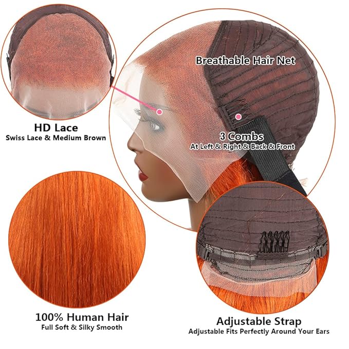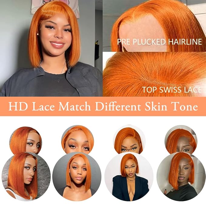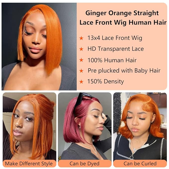 - 【Orange Bob Hair Material】Human hair wigs for women use 12A 100% unprocessed and pre plucked Brazilian virgin hair with natural hairline.The lace frontal wigs feel soft and smooth. Can be easily dyed, bleached, permed into whatever style you like.