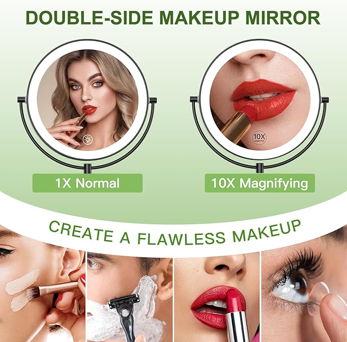 • [Double Sided 1X/10X Magnifying Mirror] 1X vanity mirror with lights for your overall facial makeup. 10X magnifying beauty mirror on the back to show details of your face when putting eyeliner, eyebrows, or lipstick, which is perfect for detail makeup.(Please keep ≀4 inch distance when using the 10x magnifying mirror to avoid dizzy. Double sided lighted makeup mirror with 1X/10X magnification will meet all your needs)