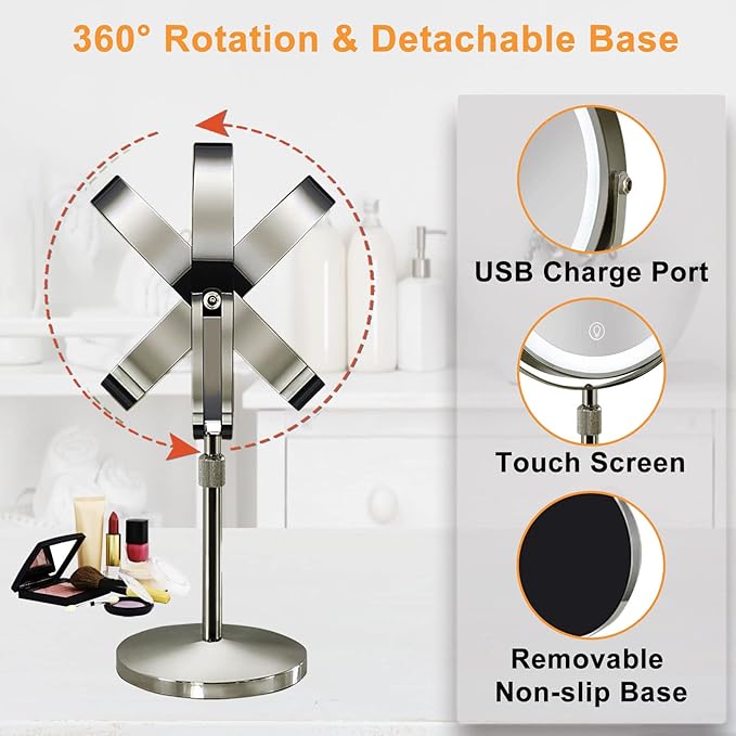- ❤ 【3 Color Lighting Modes & 360° Rotation 】:The light up mirror has 3 lighting modes: white, warm and natural. ☛ The 360° rotation function can adjust the required angle at will (not affecting use when charging).