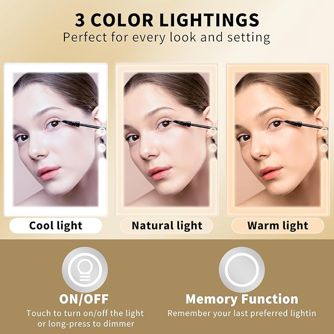 - MEMORY FUNCTION: This makeup mirror with lights features a memory function that automatically records and remembers your last used light setting. It saves you the hassle of frequent adjustments and allows you to effortlessly recreate your favorite lighting effects.
