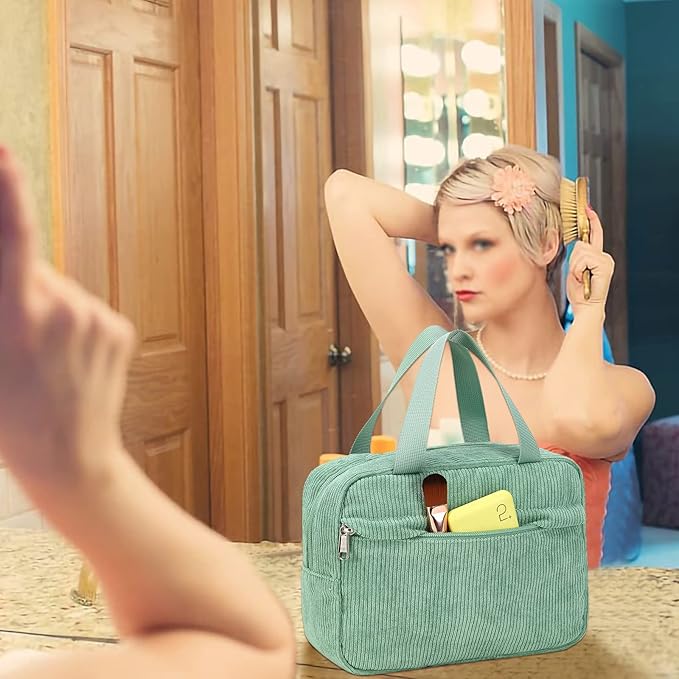 • 【Roomy space】The green travel corduroy makeup tote bag has 1 main pocket, you can put your cleanser, lotion in the large makeup bag. 1 internal side pocket can put your makeup brush. 2 internal mesh pocket, you can put some small items, such as eye shadows, etc. There are also 1 external pocket, you can put your private items, mobile phones, chargers, etc.