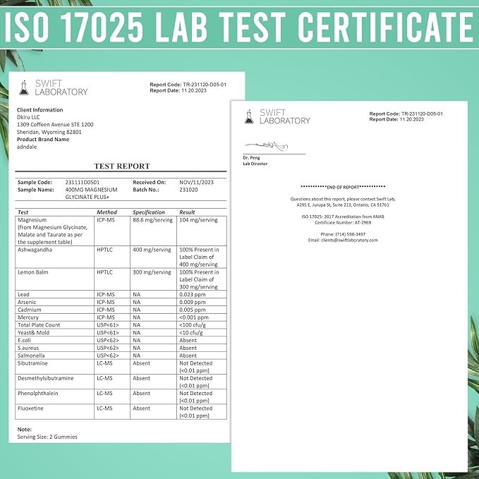 GMP and ISO 17025: Adndale Calm Magnesium Glycinate Plus+ gummies undergo production in a GMP certified facility and are third-party tested by an ISO 17025 certified lab. Lab testing of each batch ensures reliability and effectiveness as a resting support solution, with the test certificate included in the product listing