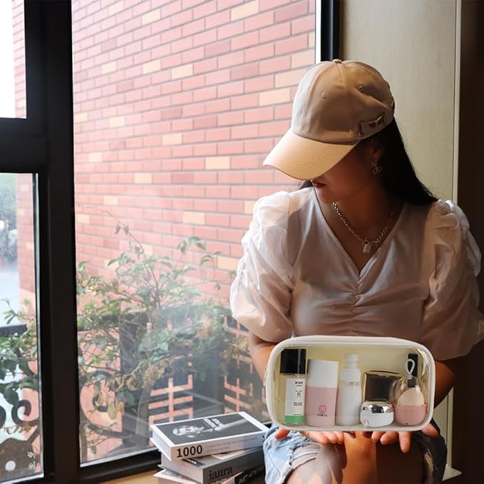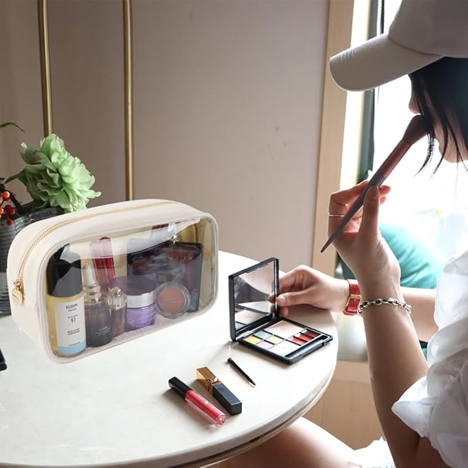 Medium Preppy Transparent Makeup Pouch Women Travel Clear TPU and Nylon Cosmetic Pouch (Medium, Beige)
