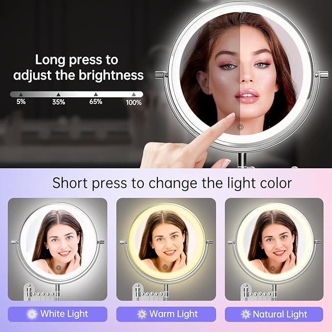 - 【3 Light Settings Adapted to Different Occasions】The vanity wall-mounted mirror features three lighting modes (white, warm, and natural) to perfectly match your makeup needs. The crisp white light ensures professional-grade precision for daily office looks, while the warm tone creates party-ready glamour. Natural light simulation provides ideal illumination for outdoor makeup applications. With dimmable brightness from 0% to 100% intensity, simply long-press the touch-sensitive button to customize lighting according to your environment and personal preference.