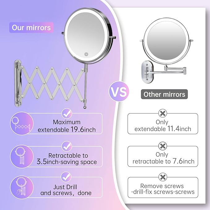 - 【No Need to Bend Over with Telescoping】360° swivel extendable lighted magnifying mirror with folding arm,19.6'' extended max. Save space and aviod to get wet the clothes when use in the bathroom. No bending design, very friendly to pregnant women.