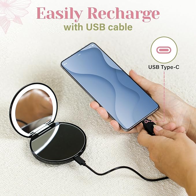 - ❤️[RECHARGEABLE LIGHTED COMPACT MIRROR] – This lighted travel mirror with magnification is rechargeable, removing the need for replacing batteries. Connect it with the charger to restore the battery after traveling all day. Stay prepared on the go with this mirror!
