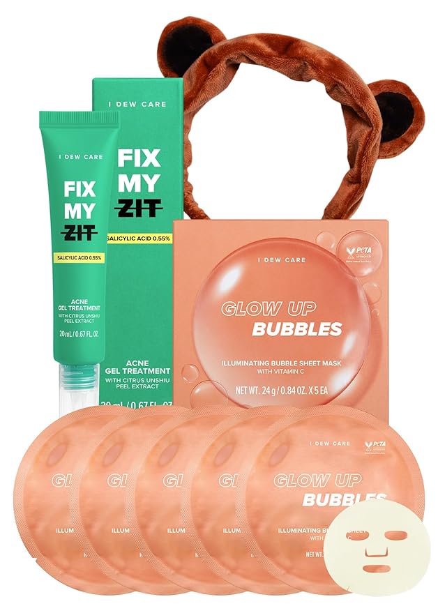 I DEW CARE Facial Skin Care Set - Glow Up Bubble & Fix My Zit & Headband | Face Sheet Mask, Acne Treatment, Clear and Soothe Irritation, Moisturizing, Korean Sleeping Face Mask